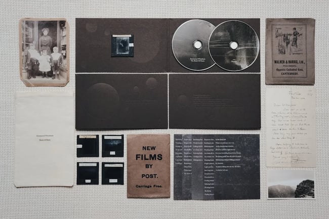 We have gone all out on this 2 x CD project which includes deluxe GF Smith 540gsm 4-panel Bagdad Brown letter-press/blind debossed covers with a Gravure emboss finish. The design also includes antique (circa: 1890 -1925) numbered glass slides, 5 x A6 poetry prints written by Emmanuel Witzthum, vintage hand written notes/letters, old ephemera photos. All rests inside hand stitched fabric pouches along with a 40 minute bonus CD from e+i (Emmanuel Witzthum & Craig Tattersall). Truly beautiful!